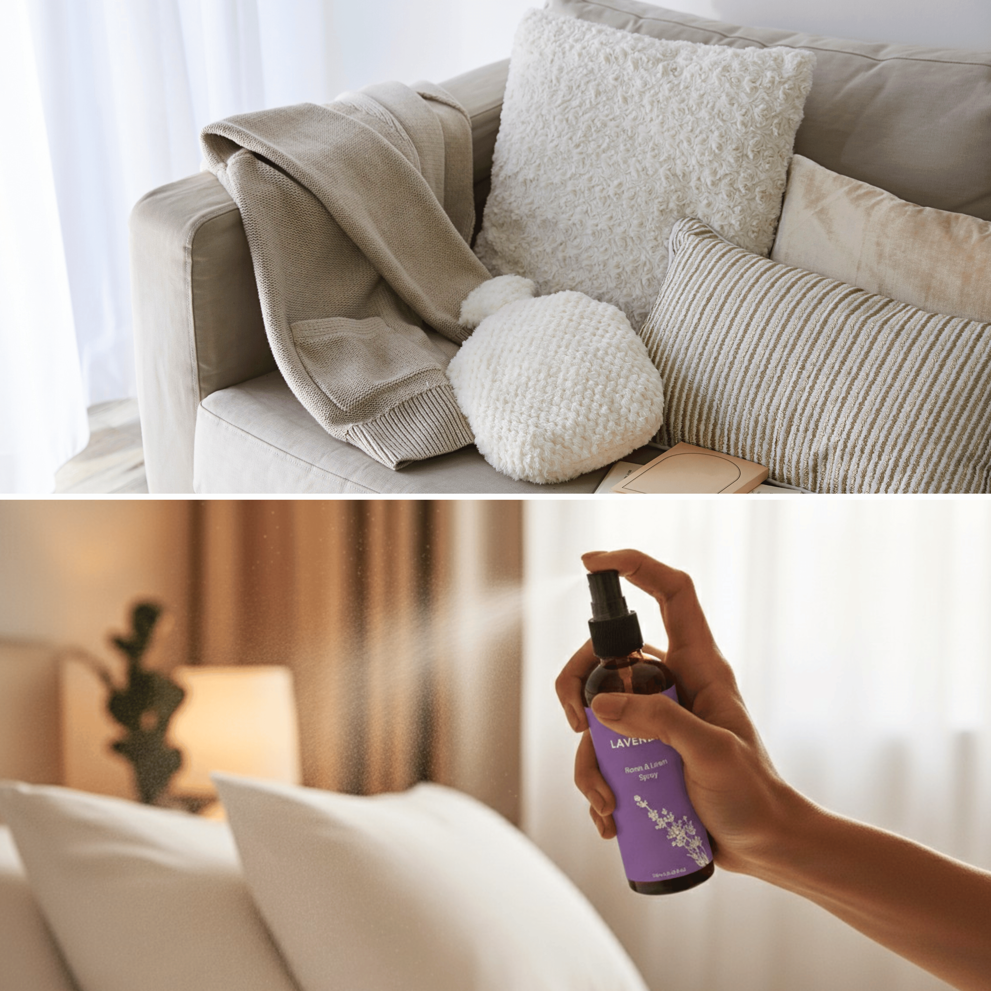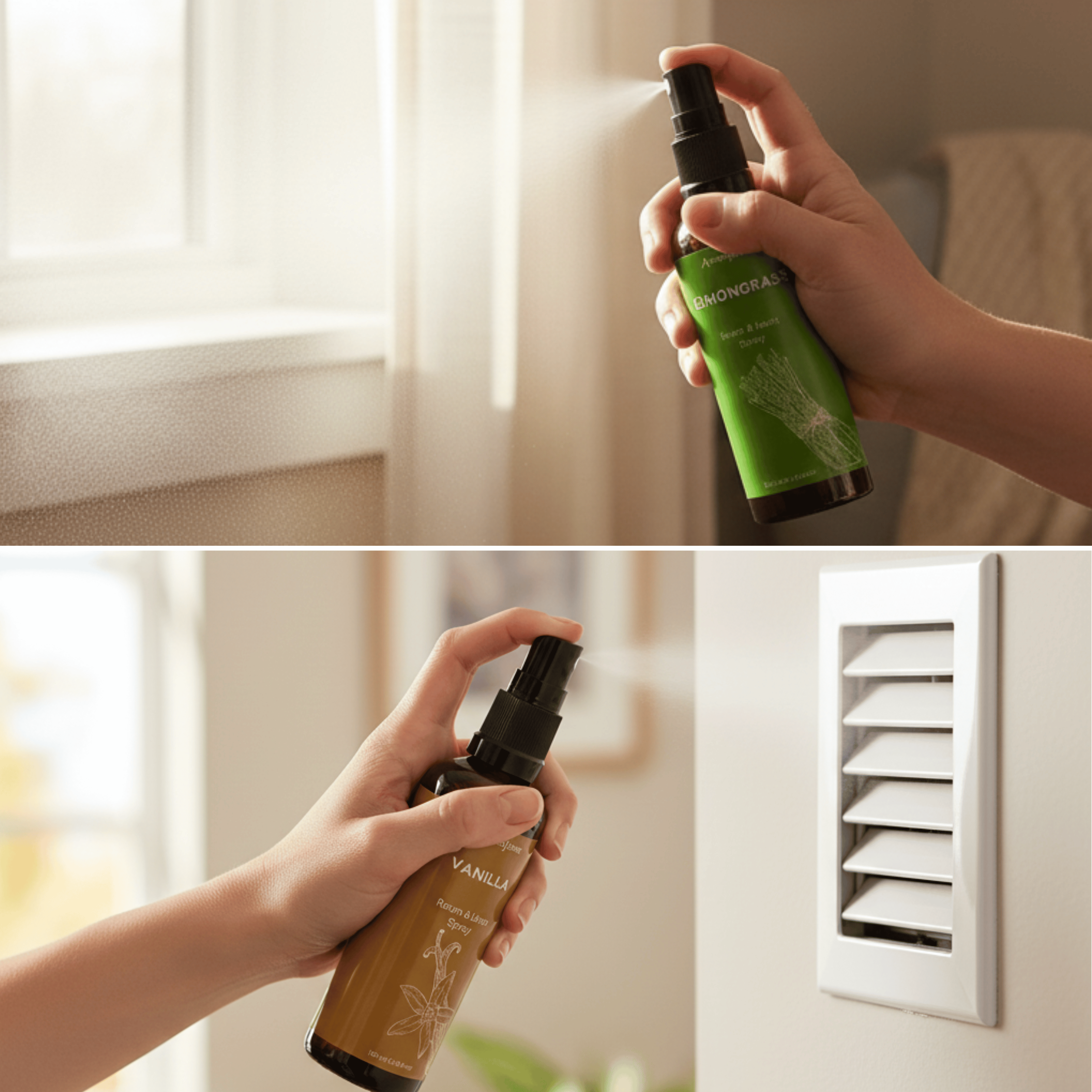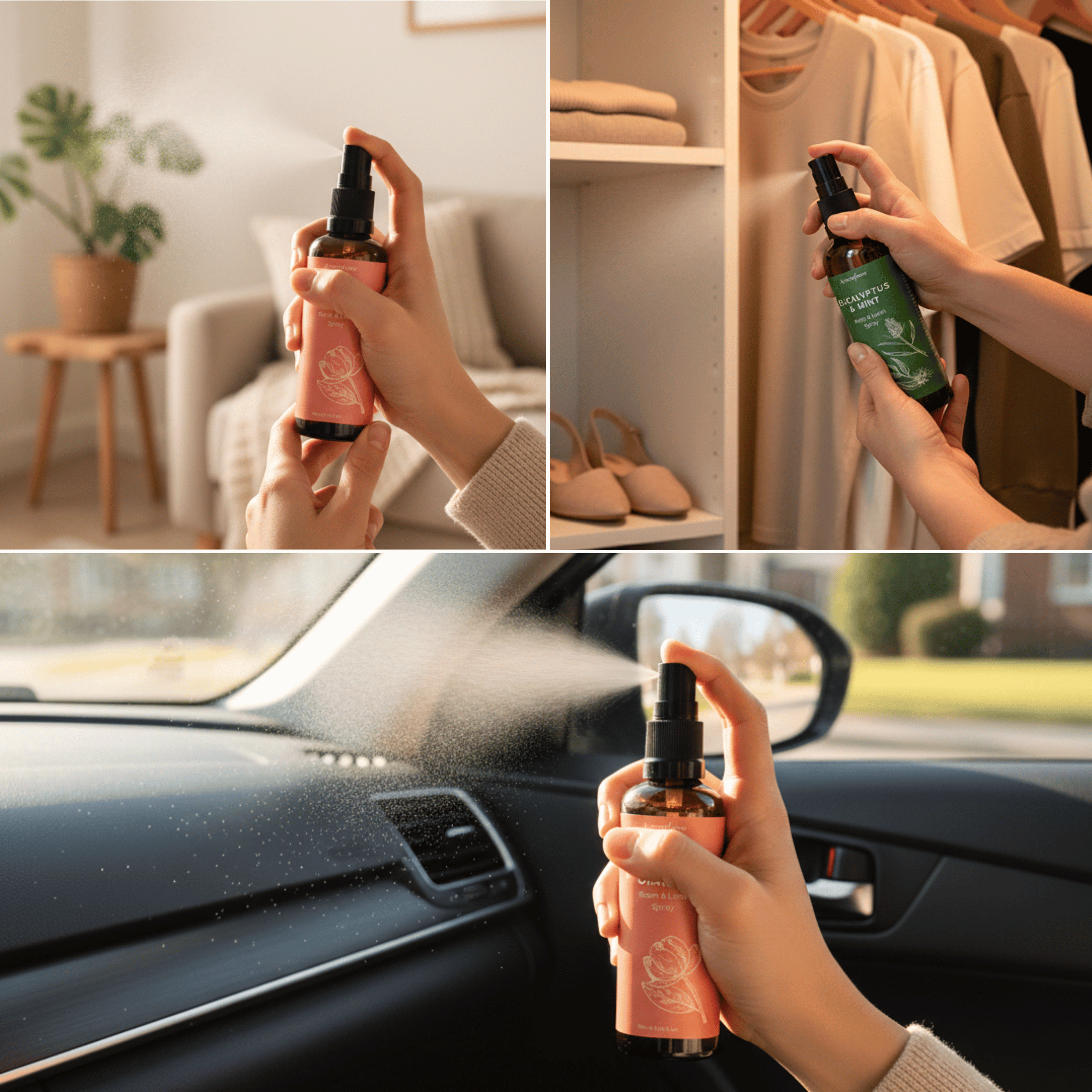 Our oil-based mists last longest on fabrics — hold the bottle a short distance away to spray evenly without leaving marks. They circulate best when misted near vents, curtains, or gentle airflow