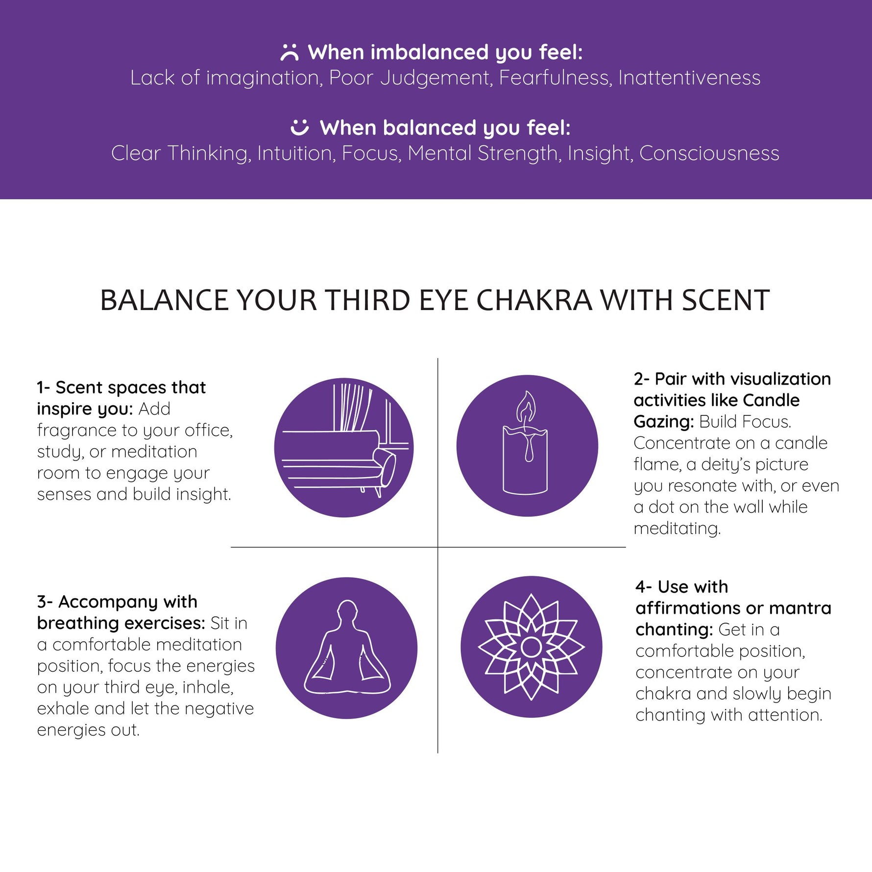 The Third-Eye (Ajna) Chakra Essential Oil blend, created by a Chakra Alignment Herb Master, feature a harmoniously balanced fragrance derived from pure aromatic extracts. Aligned with the eye, the Ajna Chakra is associated with intuition. Inhaling the scent can help release impatience, expectations, and burdens from the past, allowing for the embrace of supreme knowledge, wisdom, and facilitating sound sleep. It supports a greater sense of insight and tranquillity.