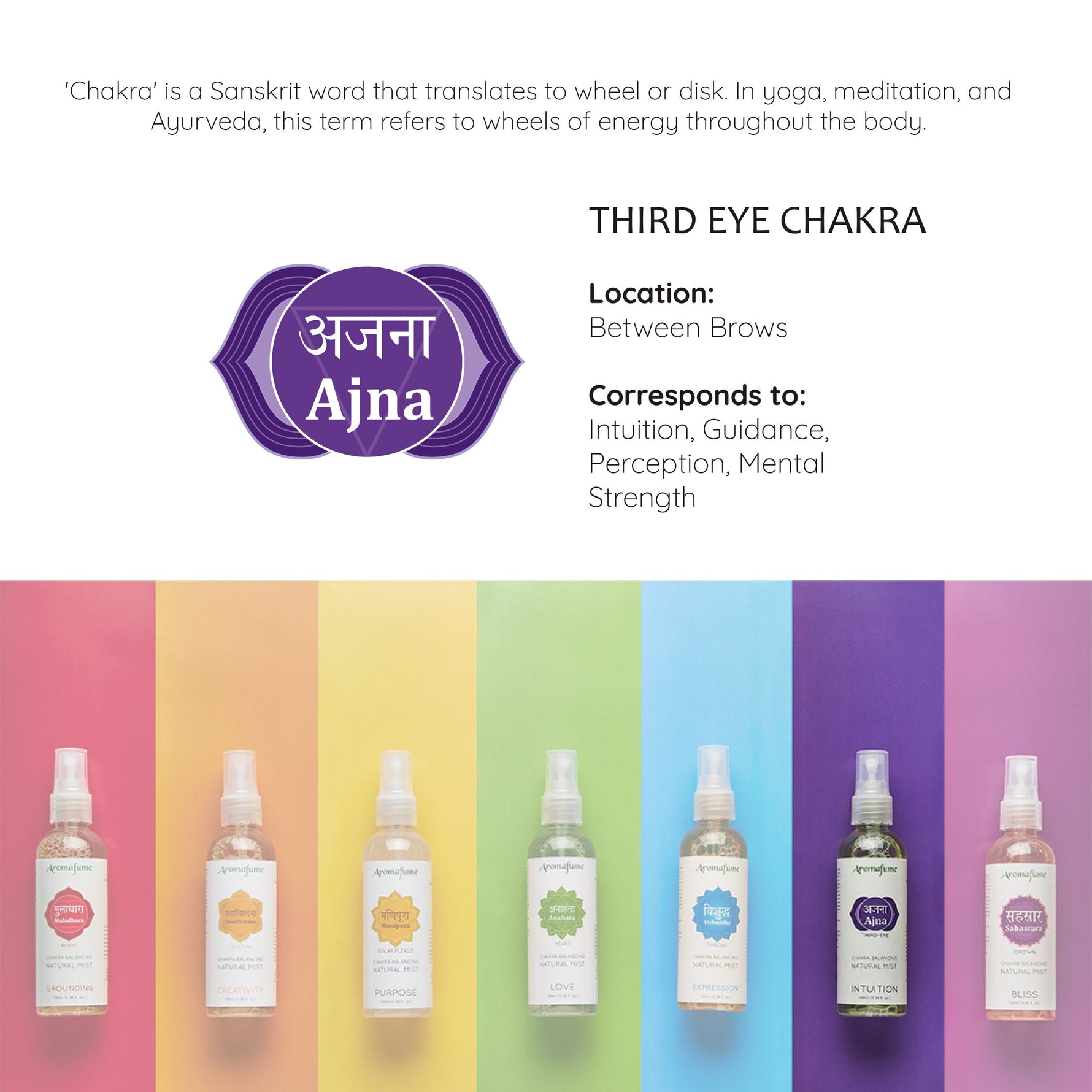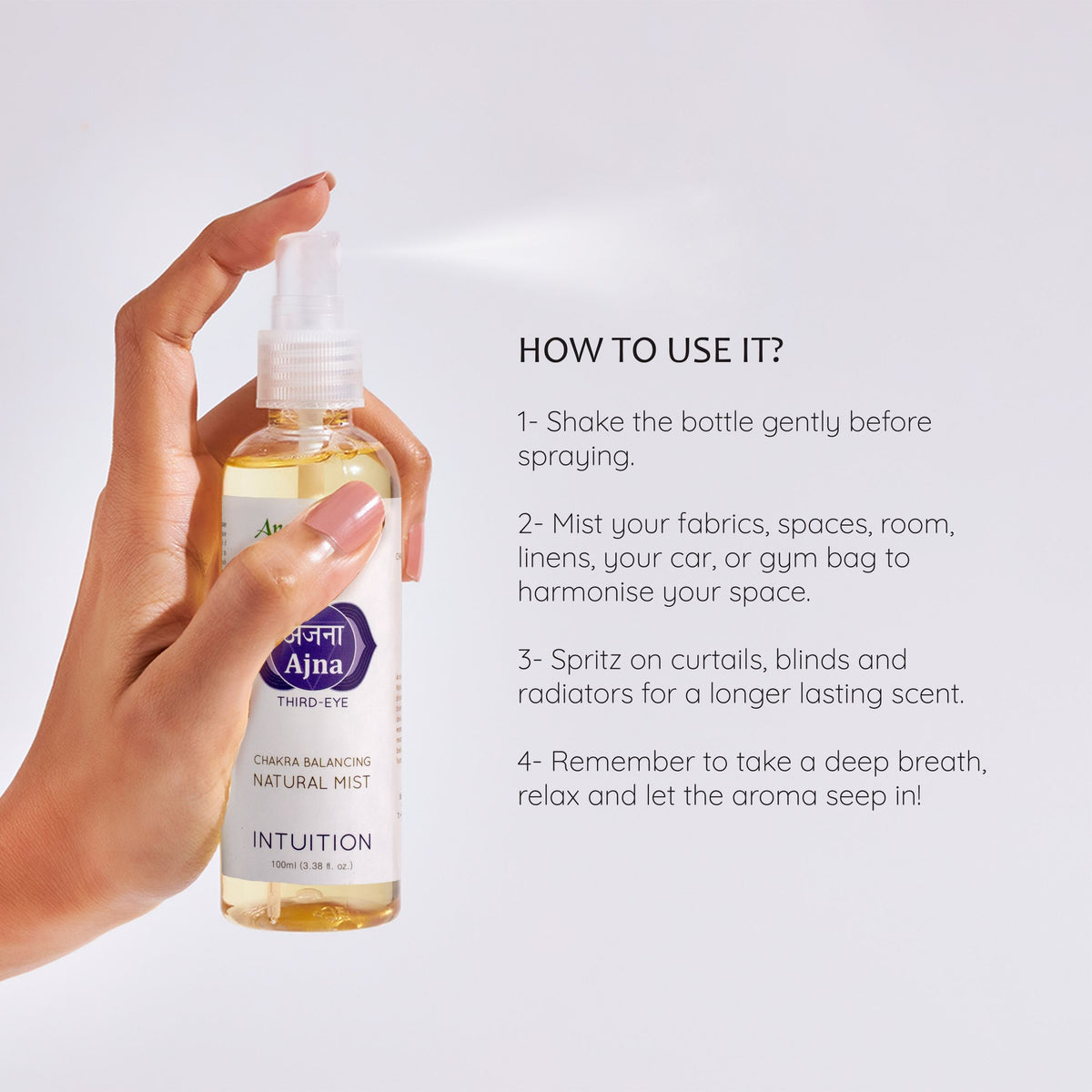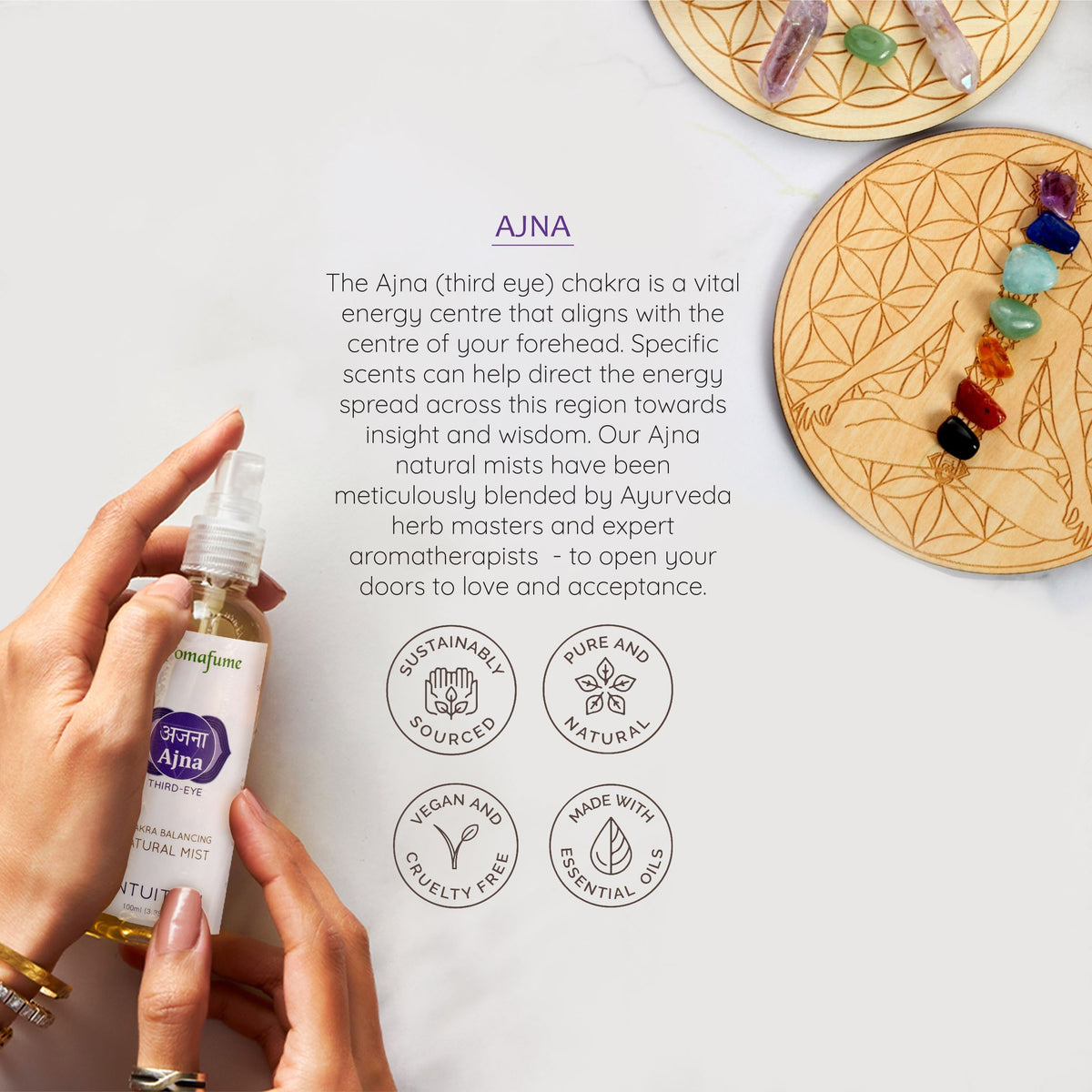 The Third-Eye (Ajna) Chakra Natural Mist, created by a Chakra Alignment Herb Master, feature a harmoniously balanced fragrance derived from pure aromatic extracts. Aligned with the eye, the Ajna Chakra is associated with intuition. Inhaling the scent can help release impatience, expectations, and burdens from the past, allowing for the embrace of supreme knowledge, wisdom, and facilitating sound sleep. It supports a greater sense of insight and tranquillity