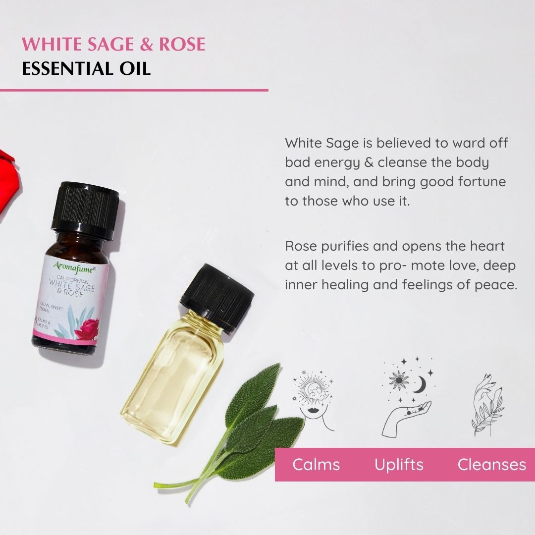 Aromafume's White Sage & Rose Essential Oil blend is a blend that purifies and invokes a sense of love and magic. These bricks contain natural Sage extracts harmoniously blended with Rose, enhancing intimacy and sensuality. This unique combination aims to rekindle romantic feelings and infuse positivity in the surroundings. Inhale the rich fragrance and restore balance in your mind, body & soul.