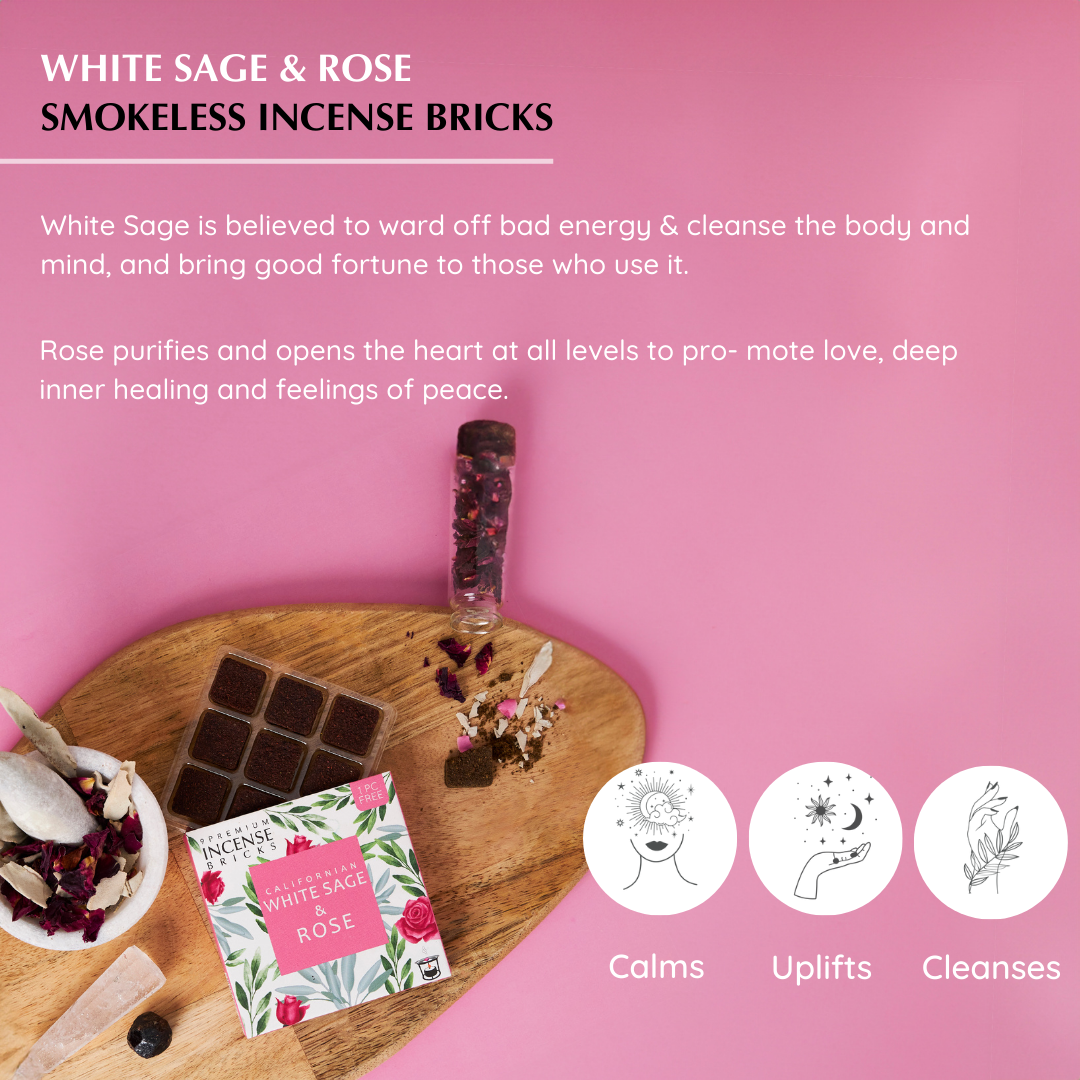 Aromafume's White Sage & Rose Incense Bricks is a blend that purifies and invokes a sense of love and magic. These bricks contain natural Sage extracts harmoniously blended with Rose, enhancing intimacy and sensuality. This unique combination aims to rekindle romantic feelings and infuse positivity in the surroundings. Inhale the rich fragrance and restore balance in your mind, body & soul.