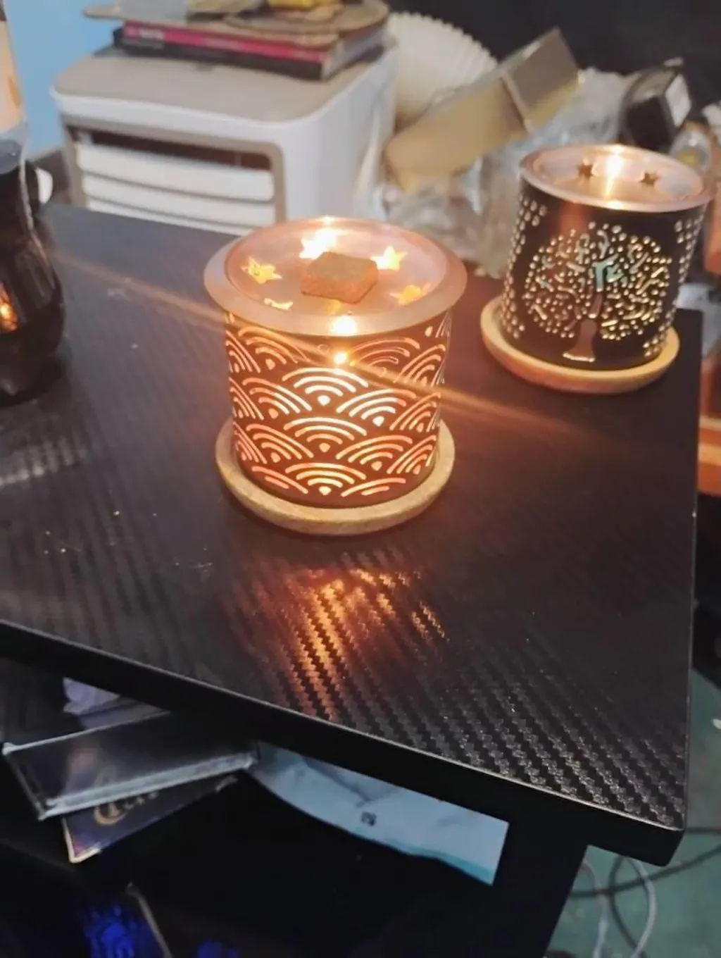 Keep away from children, pets, and any flammable items. Never leave a burning candle unattended, and always burn at your own risk. Do not touch or move a burning candle, as this may cause wax spills or fire. Avoid touching the burner during use, as it becomes extremely hot—allow it to cool completely before handling, moving, or replacing the candle. Ensure that the candle flame does not touch the plate; if soot accumulates, extinguish the candle immediately and clean the plate before relighting. Debris falling into hot wax may also cause a fire hazard. Trim the wick if necessary, as long wicks can cause dripping or flaring, and always keep the wax pool clear of wick trimmings, matches, and debris. This product is designed for use with a single, single-wick tealight candle weighing up to 0.423 oz (12 g).