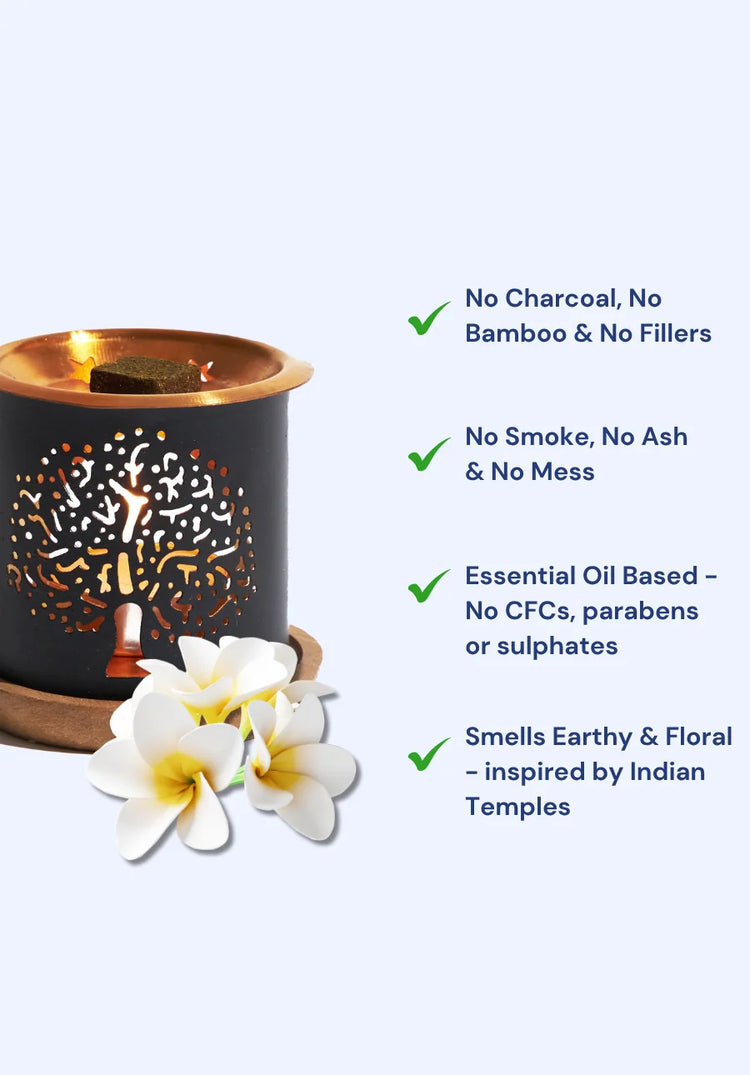 Crafted for modern living, these freshly scented incense bricks warm gently without burning, eliminating residue and mess. To use, place the brick on the Tree of Life burner’s copper plate, light a tea light candle underneath, and allow the aroma of Nag Champa to unfold slowly as the brick warms. The brick does not dissolve or produce smoke, offering a clean, effortless way to enjoy this timeless fragrance.