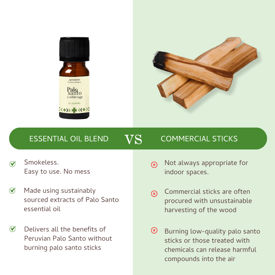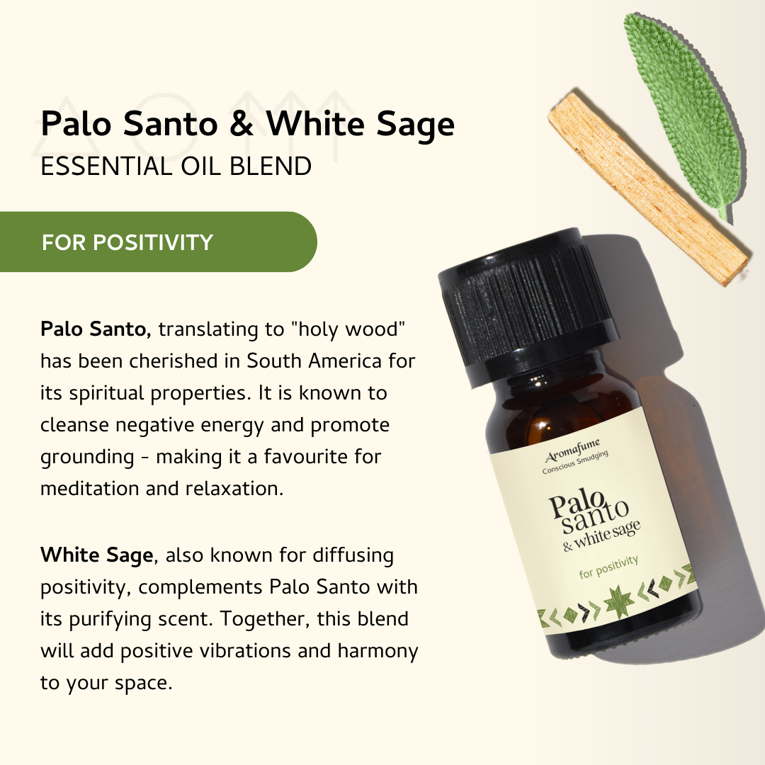 Aromafume's Palo Santo & White Sage Essential Oil blend offers a smokeless alternative to smudging. It has been carefully blended to elevate your positive energy and deepen your connection with the divine.
