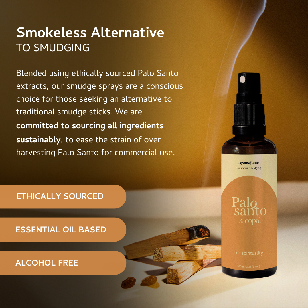 Smokeless Smudging | Natural Home Fragrance & Aromatherapy Spray | Woody & Balsamic scent to Clear Energy | Refresh your home and promote upliftment | Natural Home Fragrance| Ethically Sourced Palo Santo extract