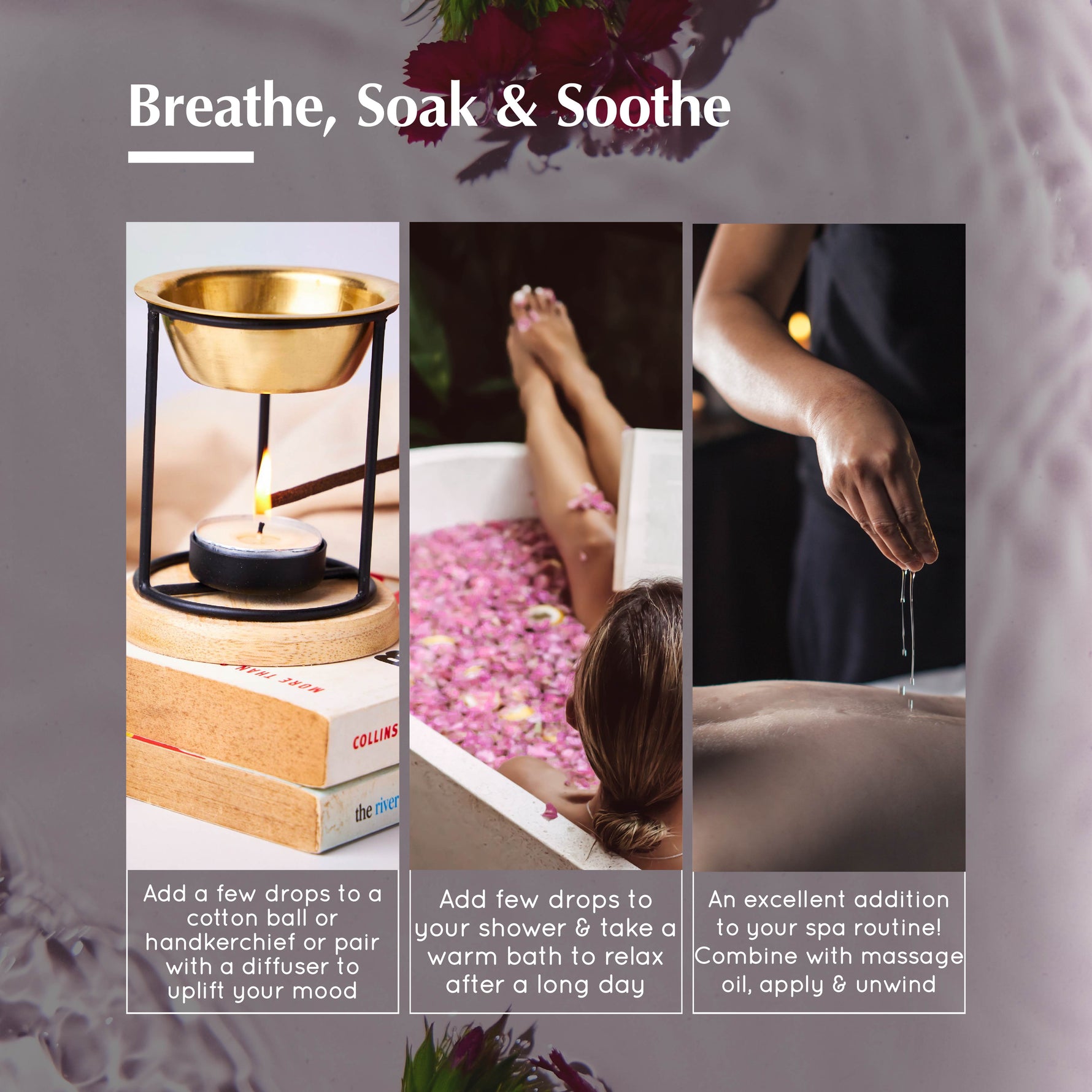 Mix a few drops with a carrier oil and add to your bath, massage routine, or body oil blend. The natural aroma helps relax the body, ease tension, and support emotional balance.