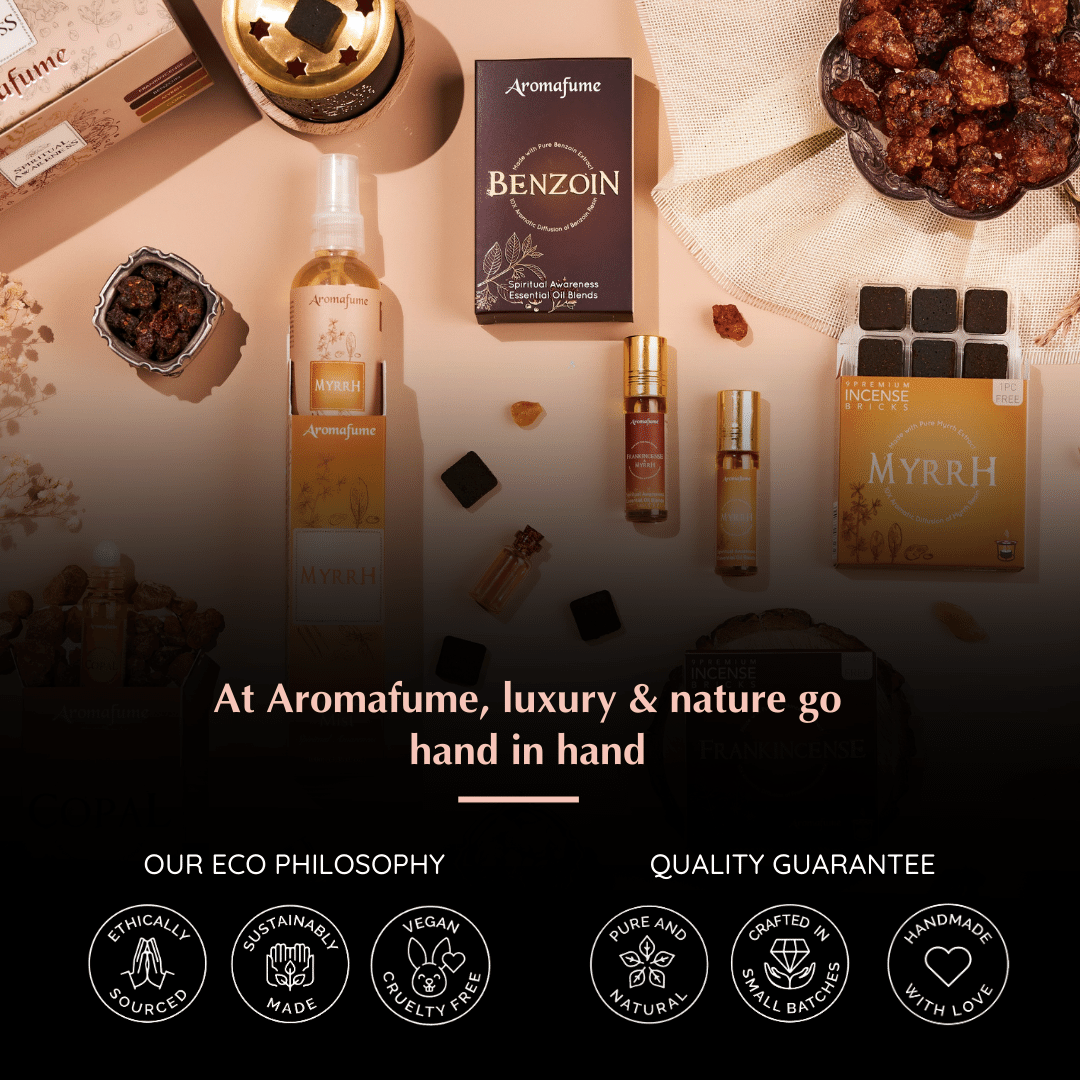 Frankincense is a Biblically significant hardened gum-like material (resin) that comes from the Boswellia Species of tree. Boswellia Carterii, native to Africa and Boswellia Serrata, native to India – are the dominant species used in our Essential Oil blend. Frankincense helps soothe the senses, calm depression and reduce anxiety. Aromafume’s Frankincense Incense Bricks/Mist/Roll-on/Essential Oil are carefully blended with Therapeutic Grade essential oils and charged with natural resin extracts.