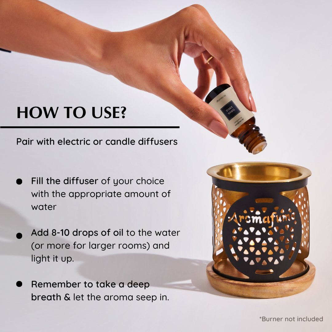 Use an electric diffuser for larger spaces and a candle diffuser for smaller rooms or enclosed areas. Always add water before the oil to ensure safe, even diffusion.