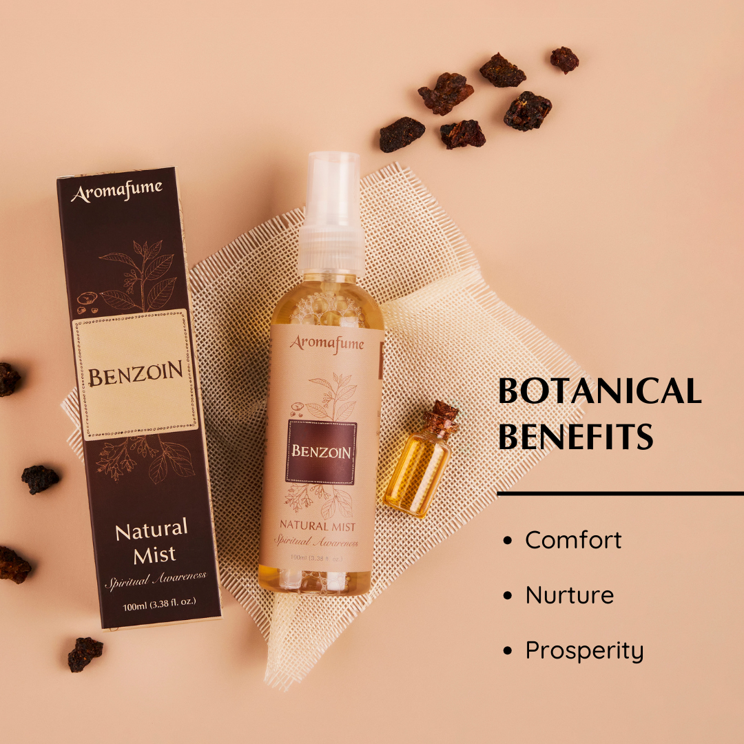 Aromafume's Benzoin Resin Natural Mist is infused with natural oils and resin extracts from trees in Southeast Asia. They diffuse a soothing woody and vanilla-like scent, promoting a peaceful and calming atmosphere, contributing to a sense of well-being.