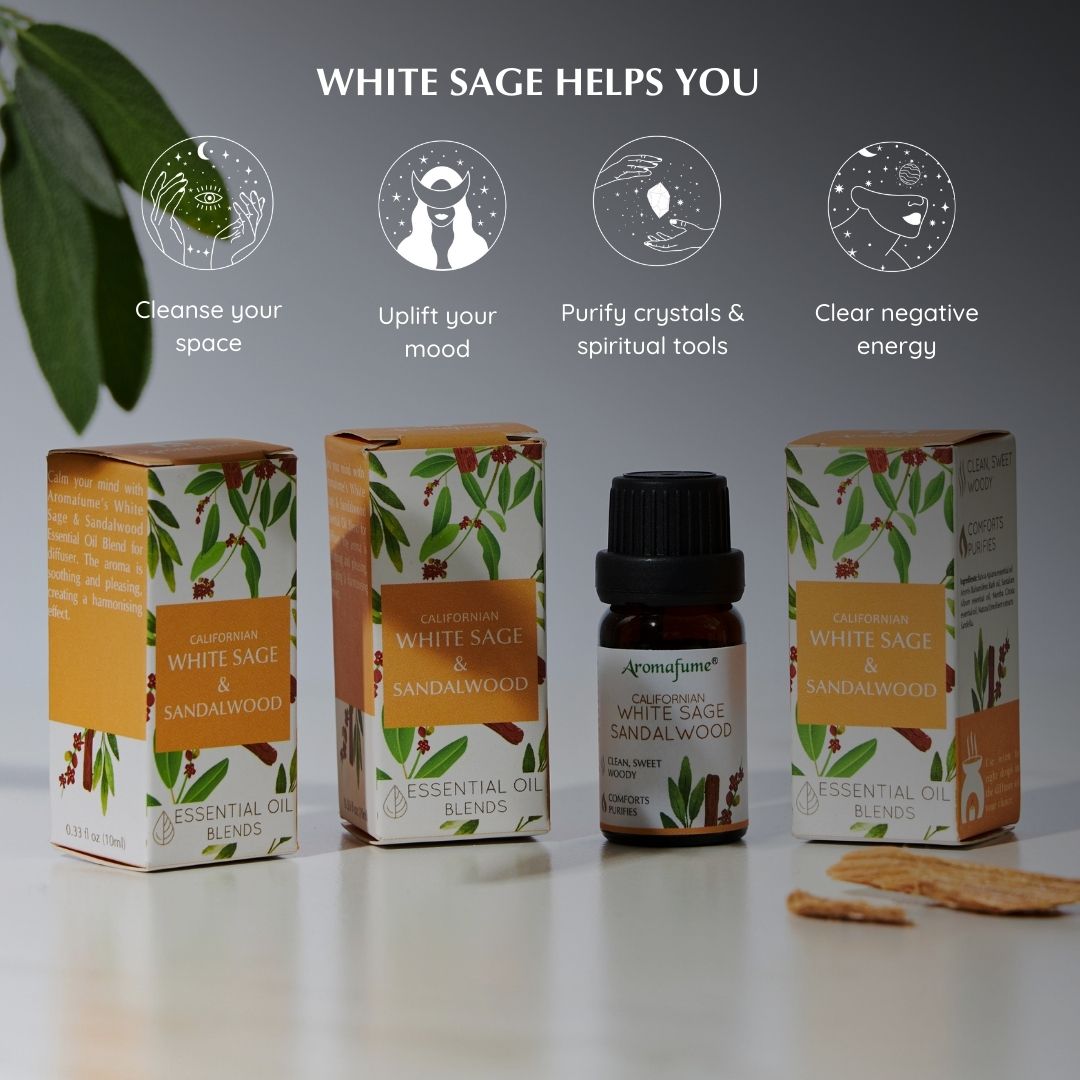 Aromafume's White Sage & Sandalwood Essential Oil is a unique blend that harnesses healing and mystical properties of both combined. In addition to their pleasant fragrance, the combination of White Sage and Sandalwood offers additional benefits, such as calming anxiety and enhancing mental well-being and overall wellness.