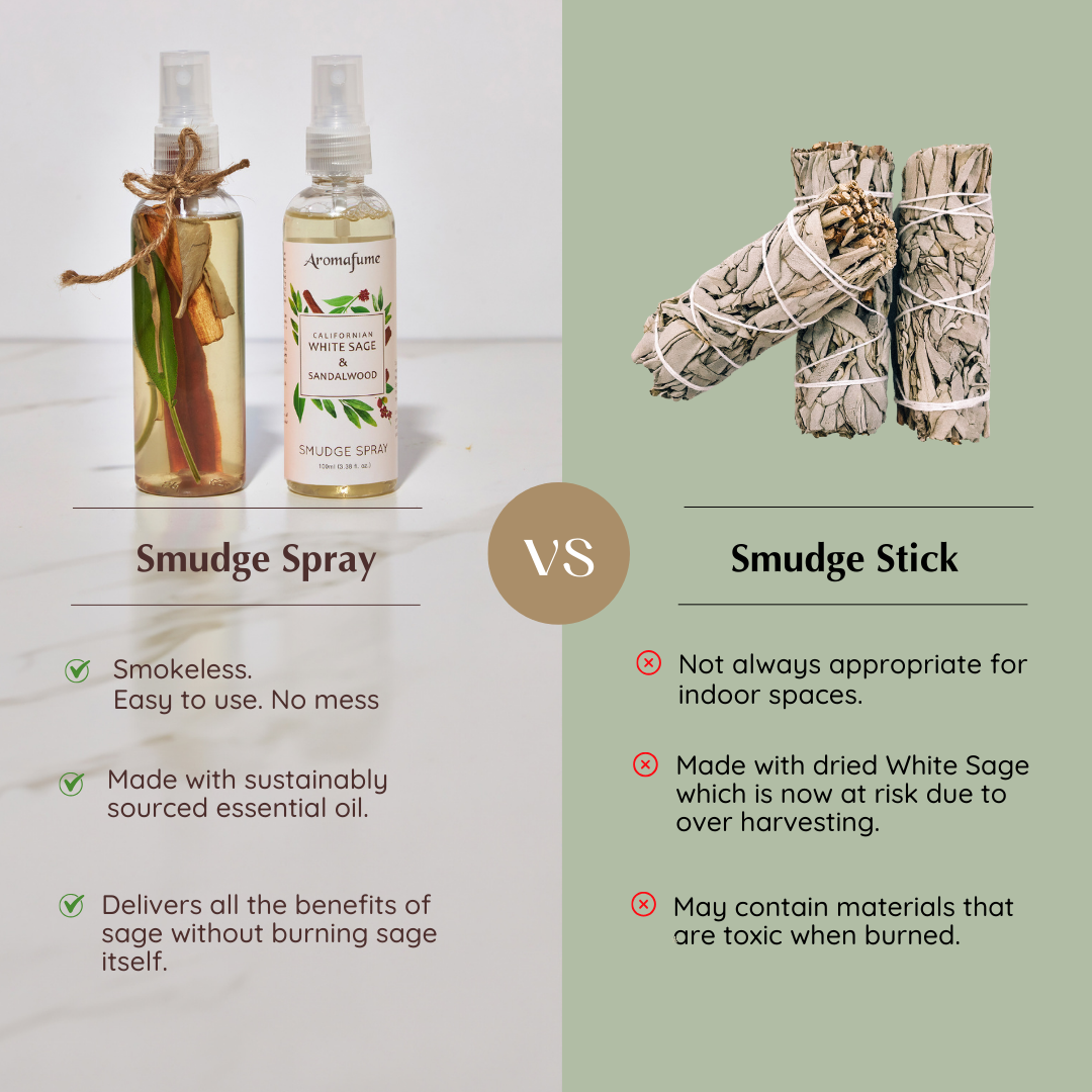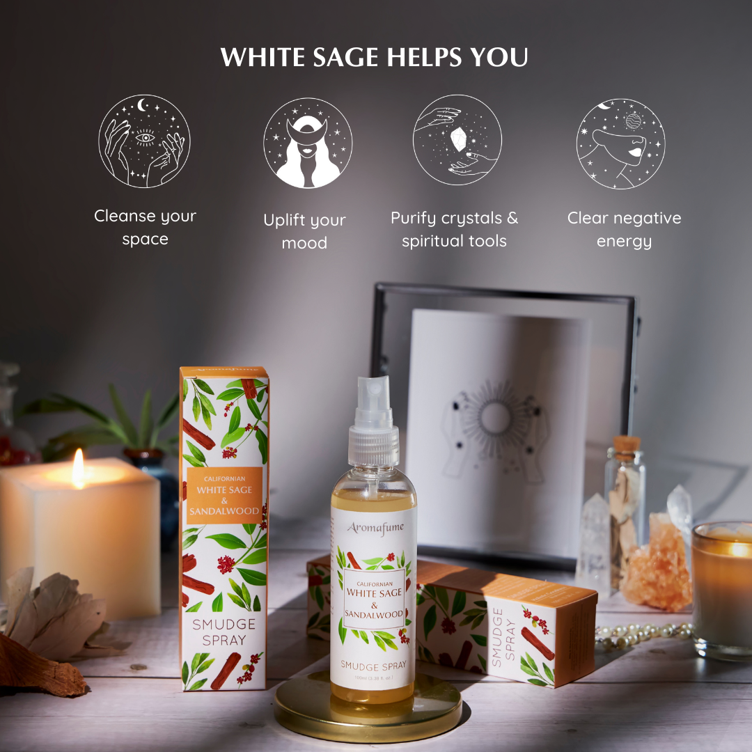 Aromafume's White Sage & Sandalwood Smudge Spray is a unique blend that harnesses healing and mystical properties of both combined. In addition to their pleasant fragrance, the combination of White Sage and Sandalwood offers additional benefits, such as calming anxiety and enhancing mental well-being and overall wellness.