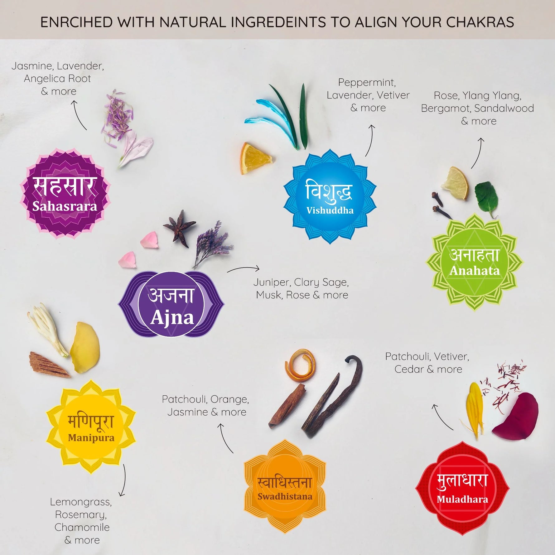Our Chakra scents are made with Ayurvedic ingredients to balance the body’s energy centers and improve overall well-being. They work great when paired with any wellness ritual.