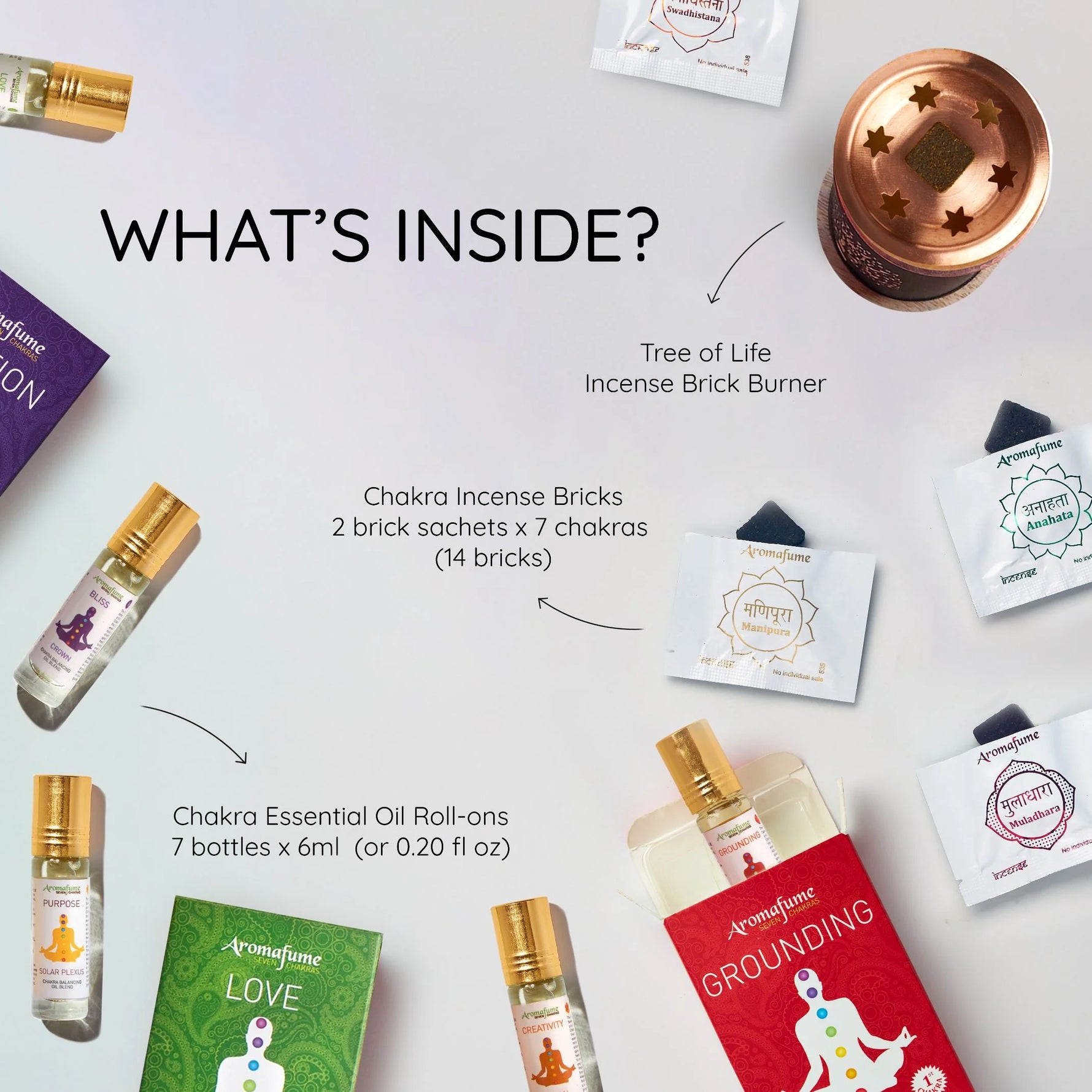 Aromatic Profile: An assortment of chakra scents like Patchouli, Jasmine, Rose, Ylang-Ylang, Peppermint and more